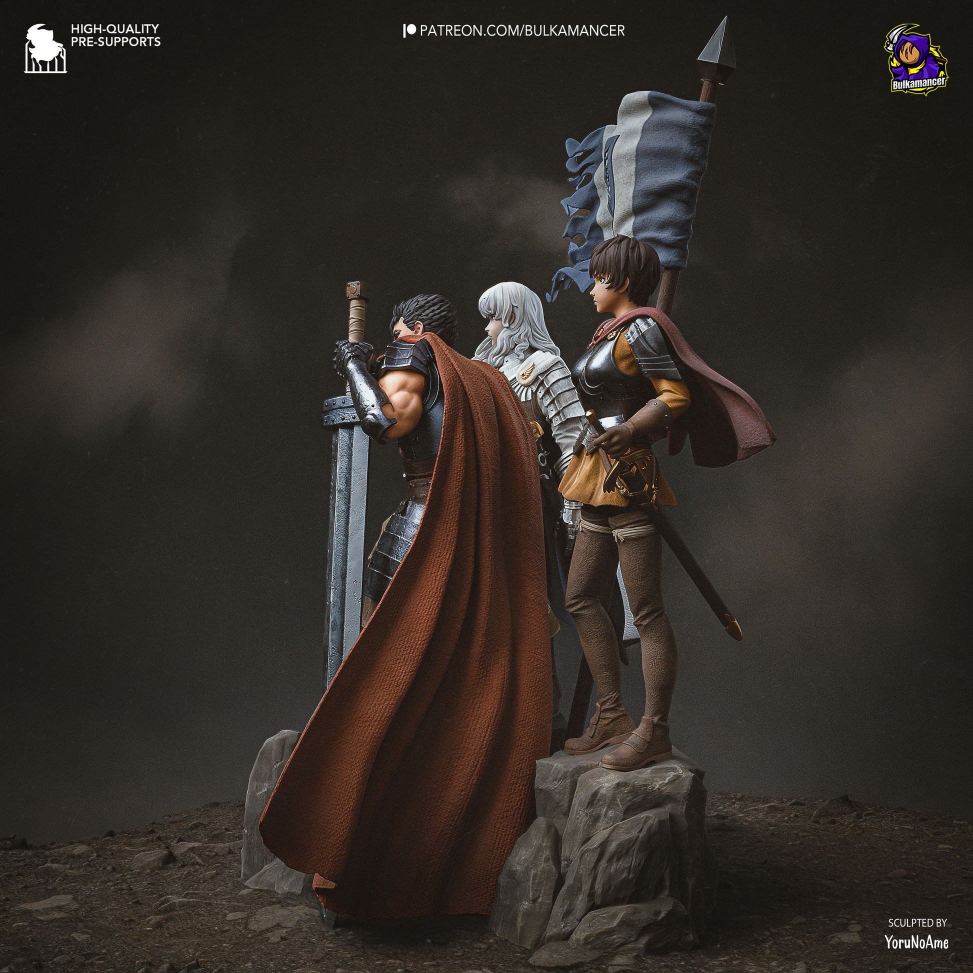 A detailed handcrafted resin collectible Berserk diorama of Guts, Casca & Griffith from Berserk.